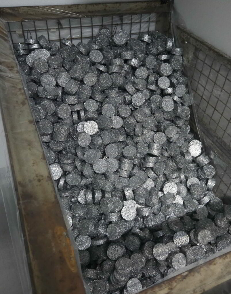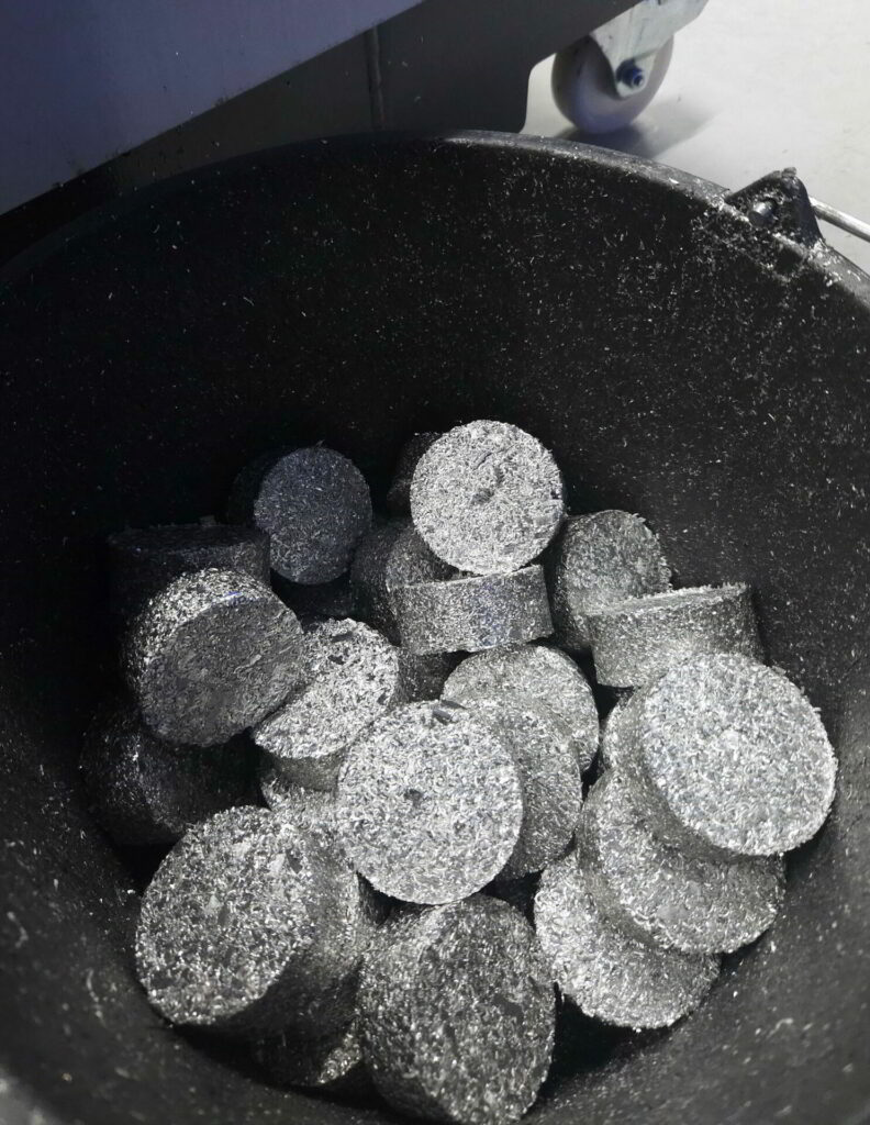 The compact aluminium briquettes, each 60 mm in diameter, 20 mm high and weighing around 110 g, have a density of approx. 2 kg/dm³. The briquette collection box only needs to be replaced after many shifts, enabling unmanned 24/7 operation of the machining centres.