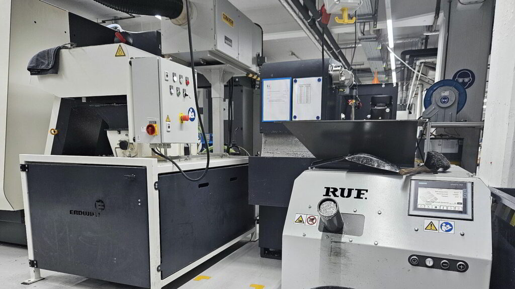 In 2022, RUF had launched the Formika, a particularly cost-effective and mobile briquetting press for smaller chip volumes, capable of processing aluminium and other metals – perfectly suited to the requirements of Carl Zeiss Sports Optics. Working closely with machining experts, RUF technical consultant Ralf Lorbach developed a system concept consisting of three RUF Formika presses and three chip shredders.